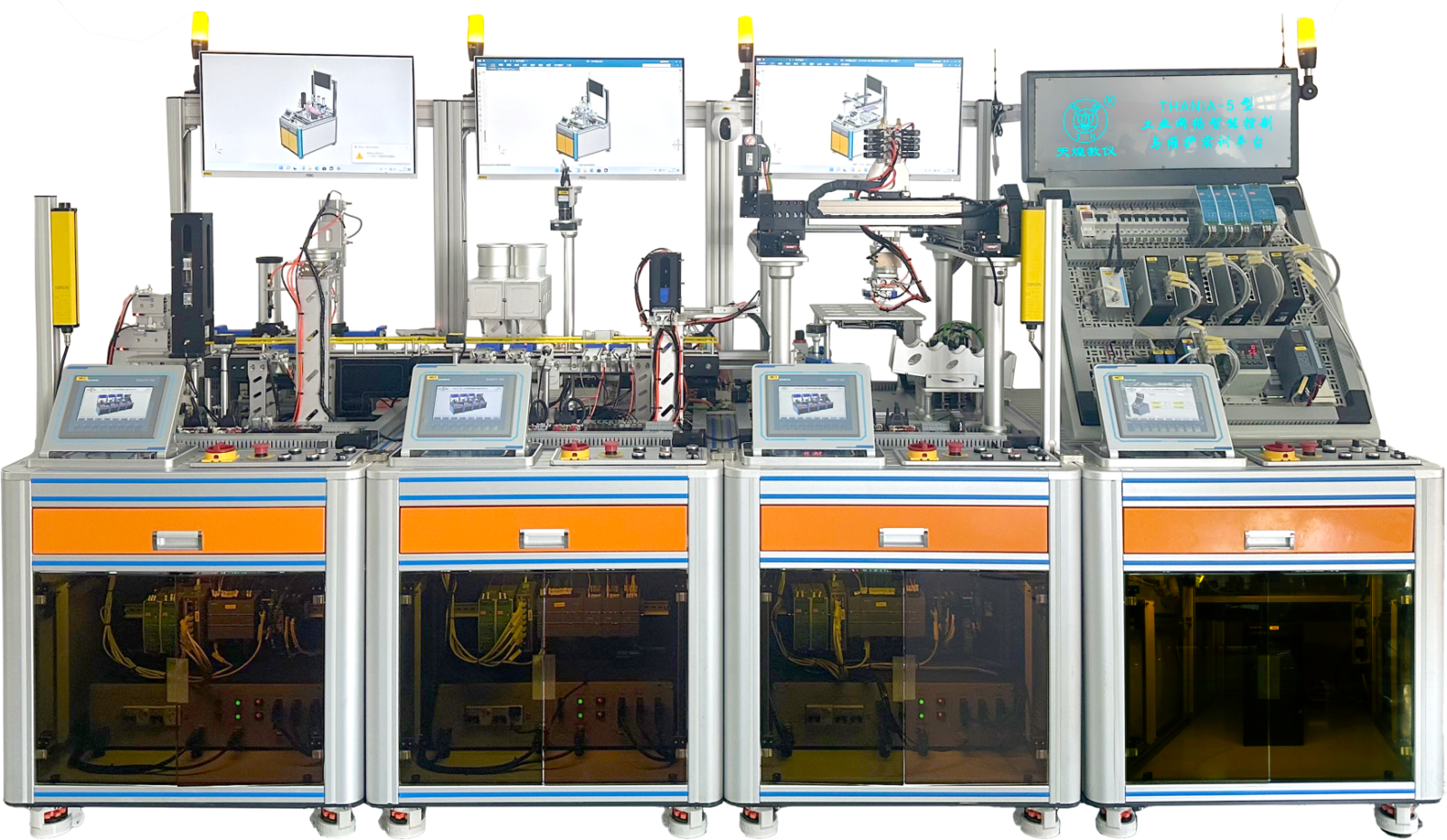 本实训平台以典型的智能制造柔性生产线为模板设计,整套平台由数据管理单元、自动供料单元、智能生产单元和智能仓储单元四大模块组成,涵盖了工业防火墙、工业三层交换机、工业无线AP、可编程控制器、现场总线、分布式I/O、人机界面、步进驱动、变频器驱动、伺服驱动、智能传感器、RFID、LoRa、机器视觉、数字孪生、云平台和组态软件等众多知识点;涉及工业网络、传感器检测、数据采集、电机控制、自动控制、数字孪生、远程运维等多种技术类型的综合应用。用户可以在平台上进行工业网络实施方案设计、关键设备选型、设备装配、系统组网和设备参数设置调试,也可用根据任务需求完成柔性生产线的多个模块自由组合,完成从原材料供料、工件装配或加工、产品质量检测、成品分类存储等多种任务类型,并且在对设备进行相关的数据采集与传输,利用数字孪生和数据看板等技术进行数字化监控与运维管理。满足各类本科院校、职业院校、职业教育培训机构对工业网络及智能工业设备的安装、调试、维护及诊断的教学、培训和技能竞赛。