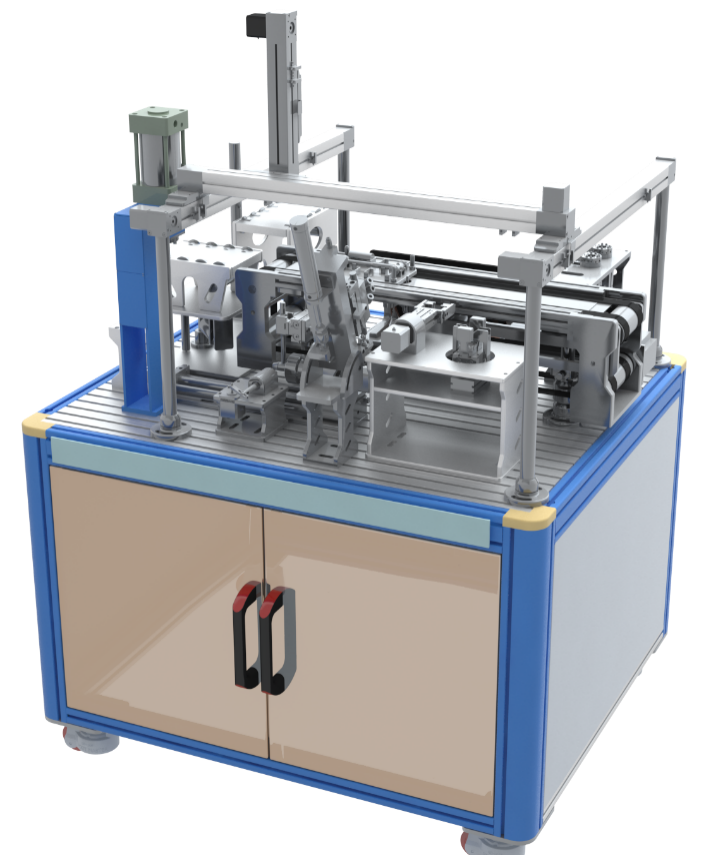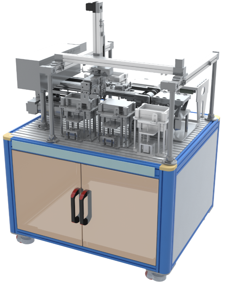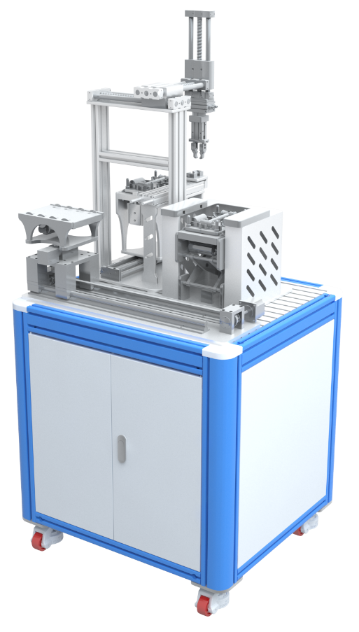 装配单元包含三维龙门机器人、装配校正模块、气动冲压机、输送线模块、快换单元、控制器、人机交互界面等,主要完成锤头装配、压紧等流程,通过AGV小车转接物料。