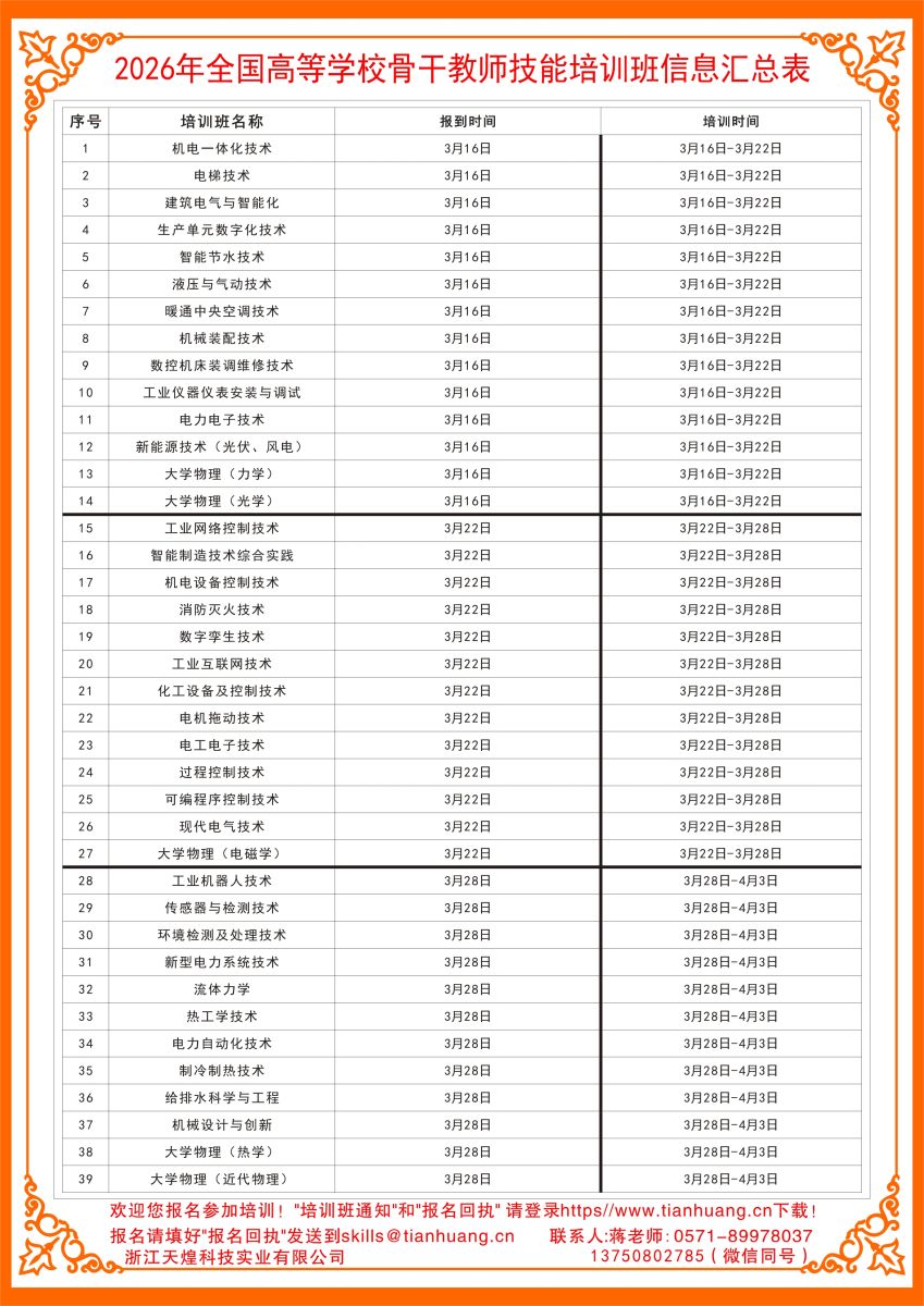 “2026年全国高等学校骨干教师技能培训班”将于2026年3月16日开始陆续在杭州西湖区“天煌教仪”举行!为了满足高等学校“新工科”背景下复合型师资团队建设的需要,教师通过培训了解产业和技术变革的现状,同时增强适应新产业发展的工程实践能力,更好地为各方面培养应用型与技能型人才服务,“天煌教仪”开设“机电一体化技术”、“电梯技术”、“建筑电气与智能化”、“生产单元数字化技术”、“智能节水技术”、“液压与气动技术”、“暖通中央空调技术”、“机械装配技术”、“数控机床装调维修技术”、“工业仪器仪表安装与调试”、“电力电子技术”、“新能源技术(光伏、风电)”、“大学物理(力学)”、“大学物理(光学)”、“工业网络控制技术”、“智能制造技术综合实践”、“机电设备控制技术” 、“消防灭火技术”、“数字孪生技术”、“工业互联网技术”、“化工设备及控制技术”、“电机拖动技术”、“电工电子技术”、“过程控制技术”、“可编程序控制技术”、“现代电气技术”、“大学物理(电磁学)”、“工业机器人技术”、“传感器与检测技术”、 “环境检测及处理技术”、“新型电力系统技术”、“流体力学”、“热工学技术”、“电力自动化技术”、“制冷制热技术”、“给排水科学与工程”、“机械设计与创新”、“大学物理(热学)”、“大学物理(近代物理)”等39个骨干教师技能培训班。现在开始接收报名,欢迎您报名参加培训班!要了解更多培训班具体信息,请登陆https://www.tianhuang.cn网站查询、下载!