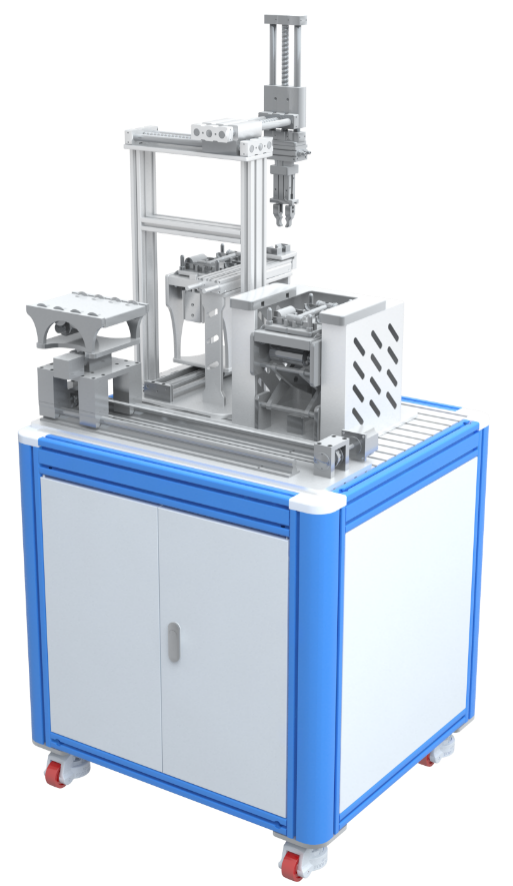 装配单元包含三维龙门机器人、装配校正模块、气动冲压机、输送线模块、快换单元、控制器、人机交互界面等,主要完成锤头装配、压紧等流程,通过AGV小车转接物料。