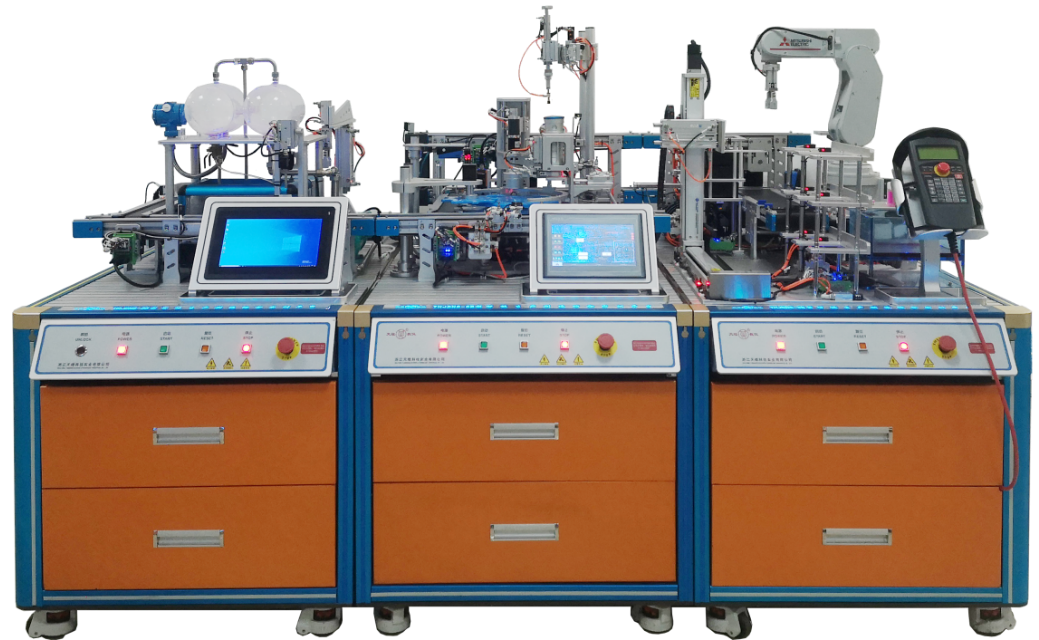 设备的每一工作单元都可自成一个独立的系统,各个单元的执行机构基本上以气动执行机构为主,搬运装箱由工业机器人结合多功能手爪完成,立体仓库单元则采取步进电机及伺服电机控制滚珠丝杆、精密定位控制,驱动系统具备多定位点特性,能够完成典型的二维位置控制,加热与检测单元采用通用变频器驱动水泵控制流量。通过设备上安装的多种类型的工业传感器,能够判断物体的运动位置、物体通过的状态、缺陷检测、外观检测及材质等。