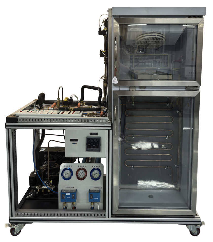 本装置是专门为职业院校开设的制冷类相关专业而研制的,装置根据制冷类行业中空调与冰箱维修技术的特点,针对空调、冰箱及双温冷库的电气控制以及制冷系统的安装与维修进行设计,强化了学生对空调、冰箱及双温冷库系统管路的安装、电气接线、工况调试、故障诊断与维修等综合职业能力。装置融合了流体力学、热力学、传热学和电气控制等技术,适合制冷类相关专业的教学和培训。