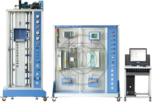 “THAWK-1型工业全数字交直流位能控制系统综合实训平台”由控制系统和对象系统两部分组成,控制系统采用网孔板结构设计,网孔板上安装西门子S7-300PLC、工业触摸屏、6RA70数字直流调速器和6SE70交流矢量变频器等工业实际设备,对象系统采用类似电梯的机械结构,设有负载箱和配重箱,驱动部分采用直流电动机和交流鼠笼电动机,构建了一套仿真位能负载系统。学生从设备安装、接线以及调试等实际操作入手,培养实际动手能力。