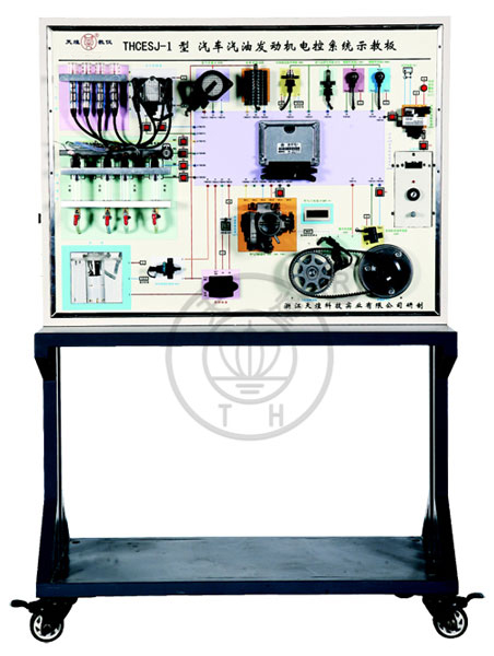 本示教板完整展示了上海大众桑塔纳2000AJR型闭路电子控制多点燃油喷射式发动机的电控系统,设备包括发动机电控单元、空气流量计、进气温度传感器、节气门组件、发动机转速传感器、霍尔传感器、冷却液温度传感器、氧传感器、爆震传感器、喷油器、点火线圈、燃油泵等真实汽车部件,能动态演示电控发动机燃油喷射、电子点火及调整过程,面板上设有相关测试点和故障设置开关,便于教师利用仪器仪表对其测试和故障现象模拟。