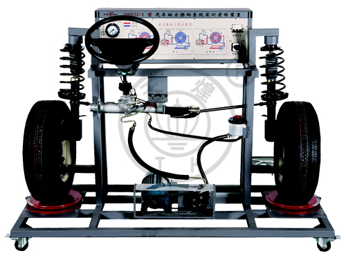 本装置采用全新大众桑塔纳2000液压动力转向系统,包括方向盘、转向器、助力泵、前悬挂、转向轮和转向管柱等,能清晰展示动力转向系统和前悬挂的外形、安装位置及连接关系。
